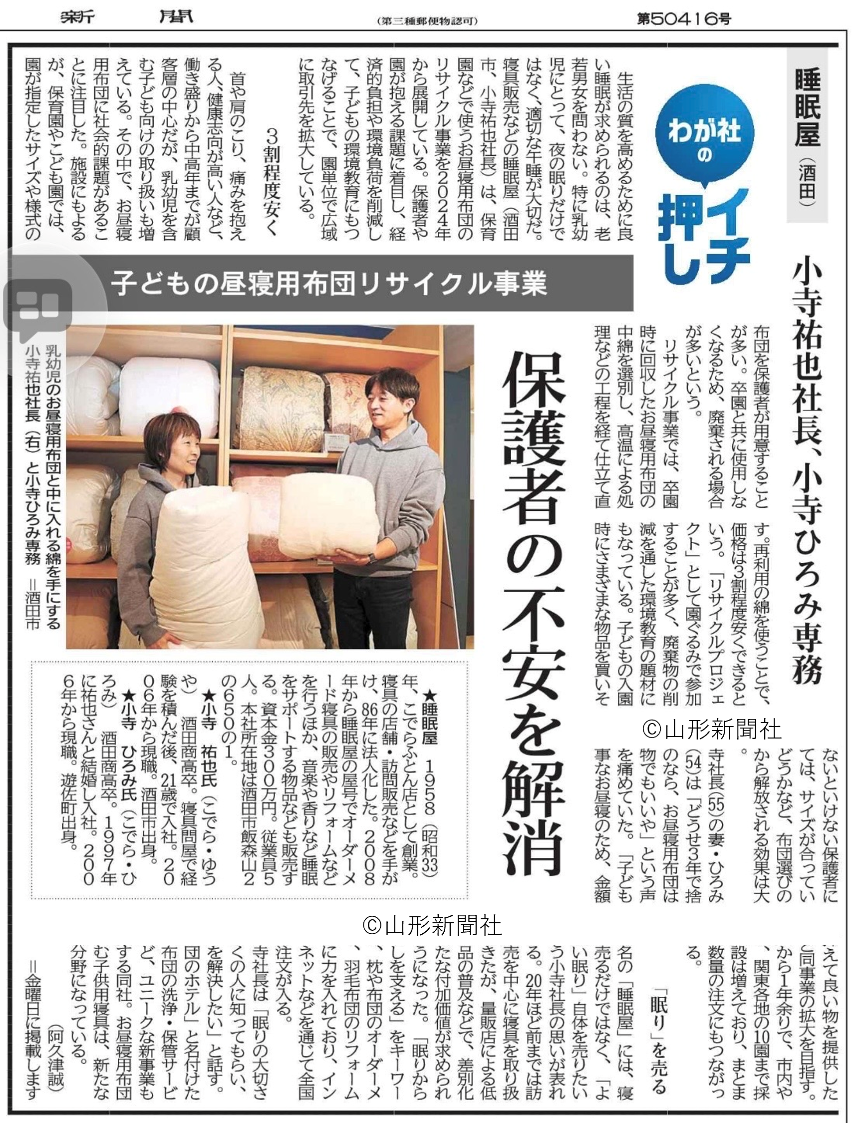今回新たに取り組んだのが子どもの昼寝用布団のリサイクル事業です。保育園やこども園では昼寝用布団の使用頻度が高く、一定期間で廃棄されるケースも少なくありません。一方、保護者にとっては「サイズが合っているか」「衛生面は大丈夫か」といった不安も大きい分野です。このような背景から回収した布団を再生・加工し、手頃な価格で提供する仕組みを構築。環境負荷の軽減と保護者の経済的負担の軽減を両立するモデルを打ち出しました。当社では、この取り組みを単なるリサイクル事業ではなく「睡眠屋らしい事業」として再定義するとともに情報発信と販路拡大の支援を行っています。ポイントは、価格訴求ではなく安心の提供。再利用という言葉が持つ不安を払拭するため工程の可視化、品質基準の整理。保護者の不安を解消する事業という軸を明確にしました。あわせて、社会的意義の打ち出し方も整理しました。廃棄物削減という環境価値に加え、保育施設や自治体との連携可能性を見据えた事業設計へとブラッシュアップし、単発の取り組みではなく地域循環型のモデルへの可能性を高めました。この取り組みは26年1月9日の山形新聞で紹介されました。
